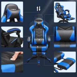 Songmics Gaming-Stuhl RCG026B01, Mit Fußstütze, Schwarz / Blau, Kunstleder, Kopfstütze, Bis 150 Kg