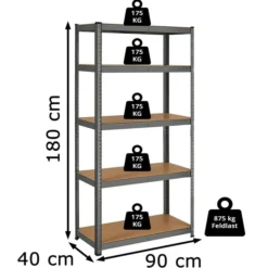 Songmics Schwerlastregal Grau, 90 X 180 X 40cm, 175kg / Boden, Steckregal, 5 Holzböden