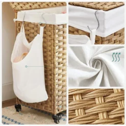 Songmics Wäschekorb LCB64WT, Weiß, Mit 2 Fächern, Bambus, Faltbar, 51,5, X 60,5 X 31,5 Cm, 100 Liter