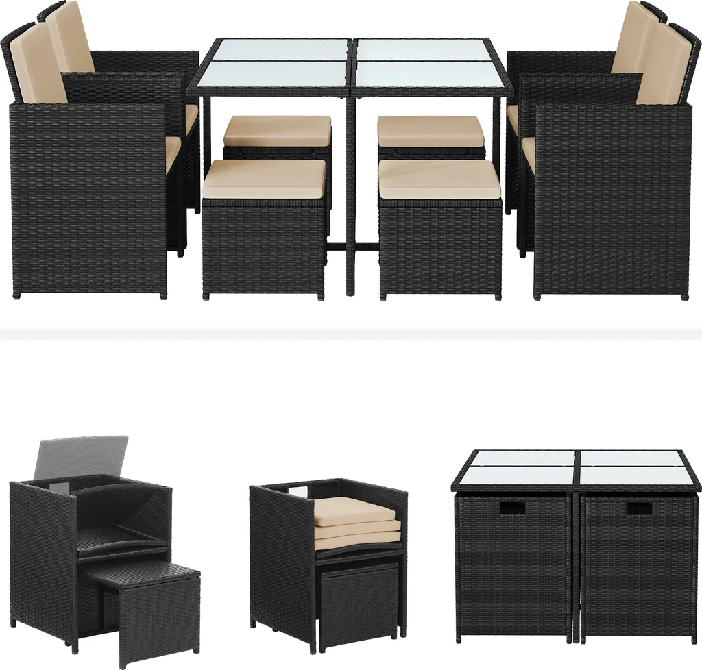 Ein 9-teiliges Möbelset nimmt so viel Platz in Anspruch wie ein Tisch? Ja, das ist möglich! Dank des cleveren Designs dieses Möbelsets können Sie die Hocker unter die Stühle schieben und die Stühle unter den Tisch schieben. So sind diese Möbelstücke bei Nichtgebrauch platzsparend verstaut. Ganz praktisch!