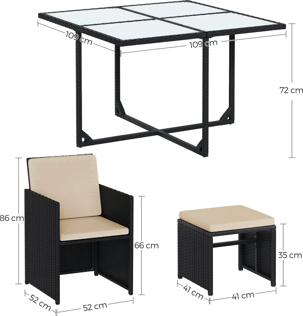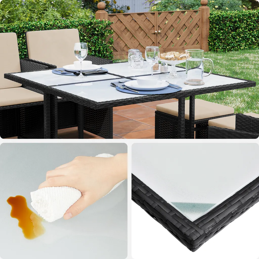 – Material des Stuhls und Tisches: PE-Polyrattan (Polyethylen), pulverbeschichteter Stahl, Hartglas