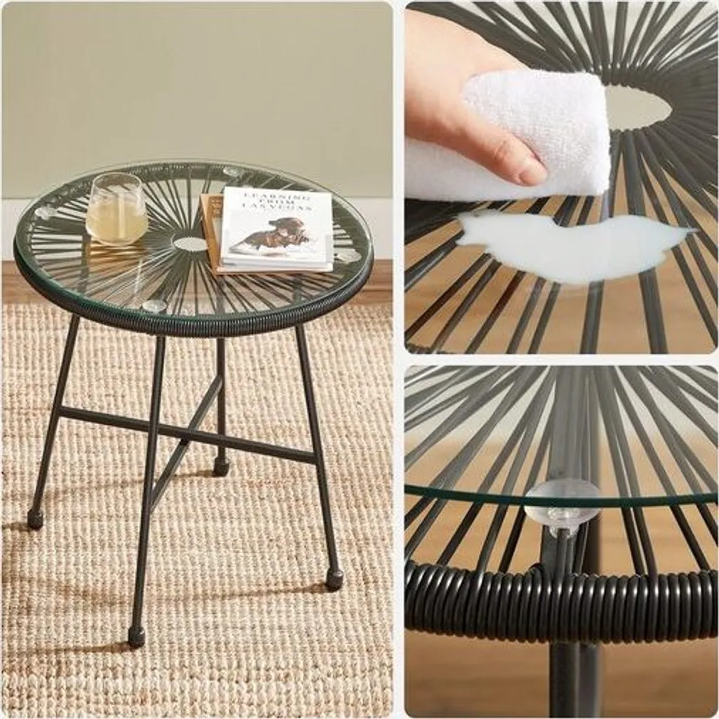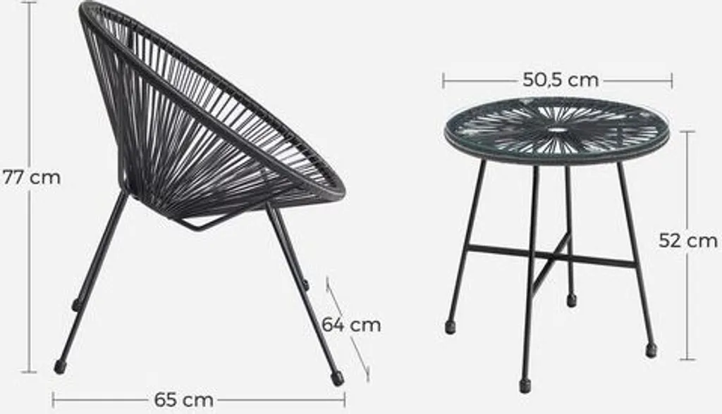 den rostfreien, robusten Stahlbeinen und dem leichten, aber verschleißfesten PE-Polyrattan. Dadurch trägt jeder Stuhl bis zu 130 kg. Der Beistelltisch hält dank seiner Hartglasplatte bis zu 60 kg aus