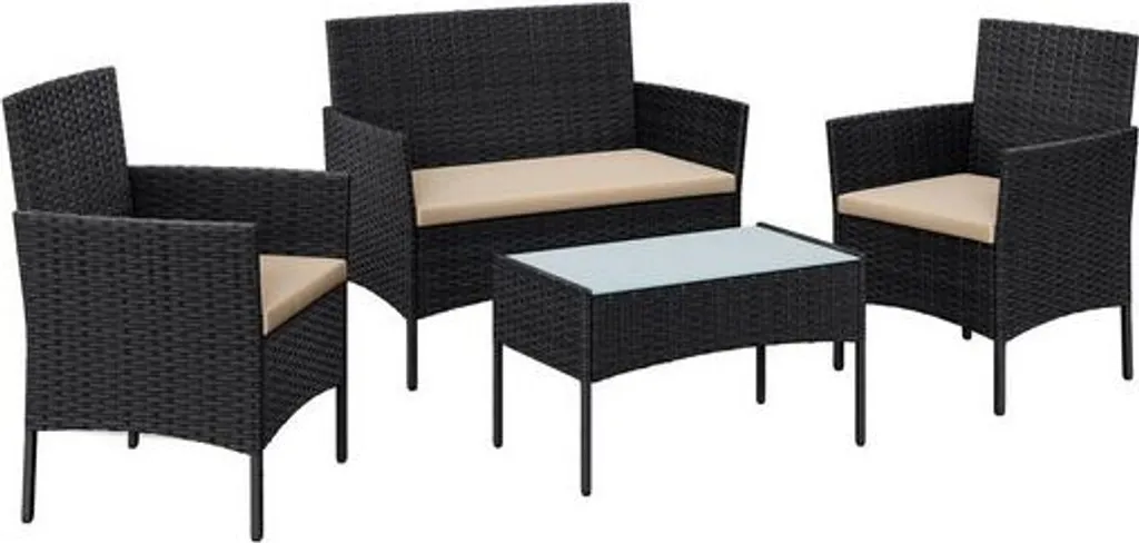 Komfort muss sein: Setzen Sie sich auf diese Gartenmöbel, gepolstert mit 5 cm dicken Sitzkissen, lehnen Sie sich zurück und genießen Sie die Natur! Die abnehmbaren Kissenbezüge und die Tischplatte aus Glas sind außerdem leicht zu reinigen