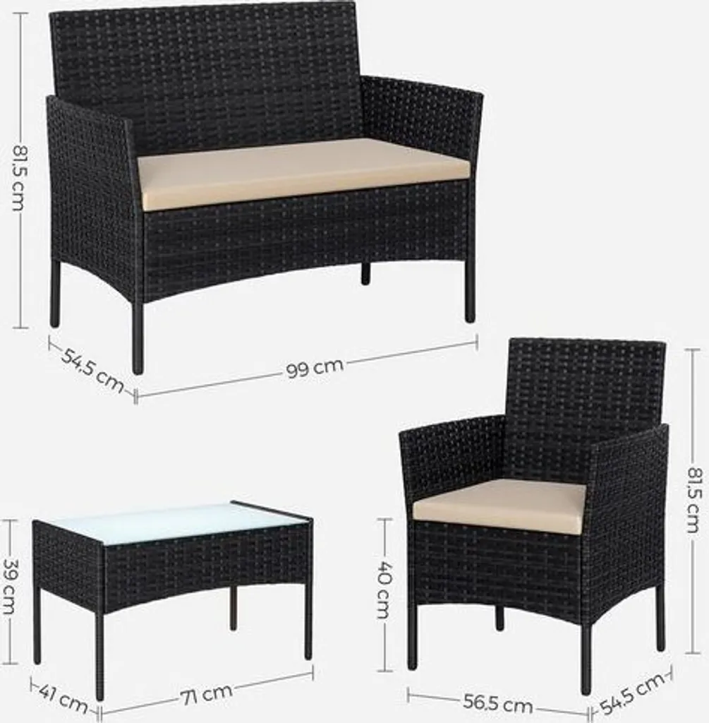 – Material des Stuhls, Tisches und Sofas: Gestell aus verzinktem Metall, PE-Polyrattan, Hartglas,