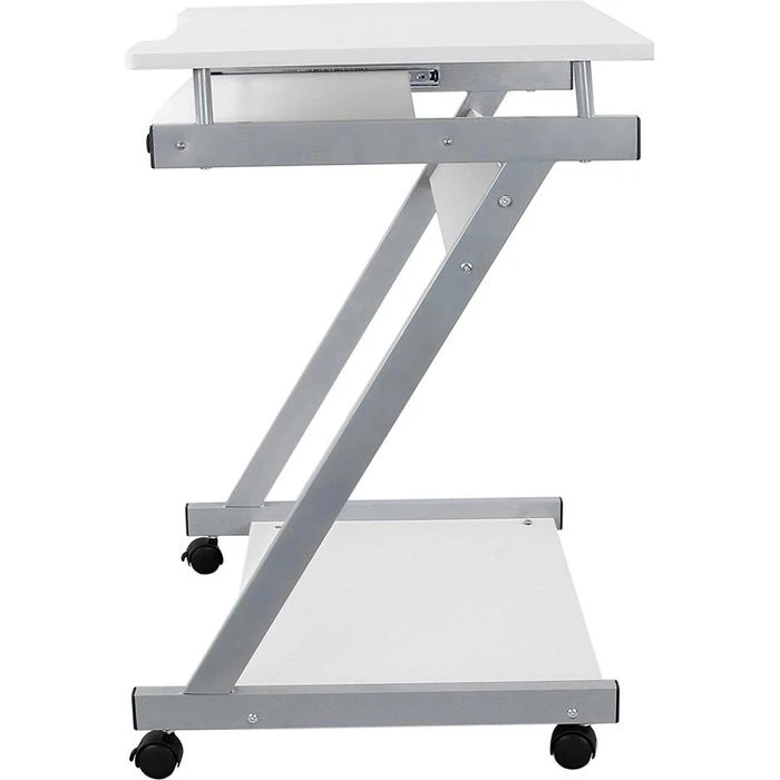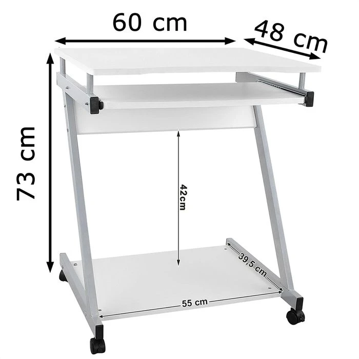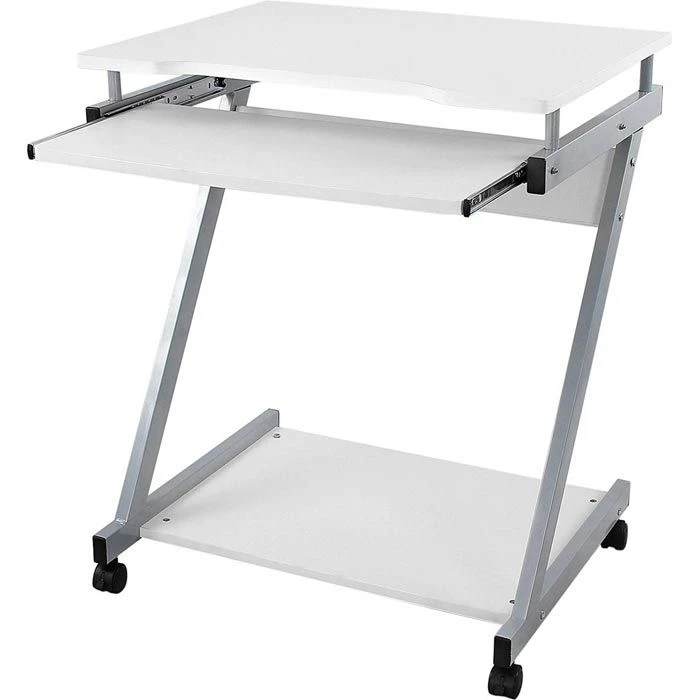 Der kompakte Computertisch besteht aus einer melaminharzbeschichteten Spanplatte und pulverbeschichtetem Metall. Die Platte ist 15 mm dick.