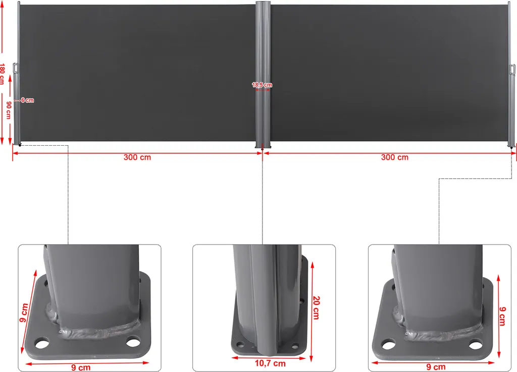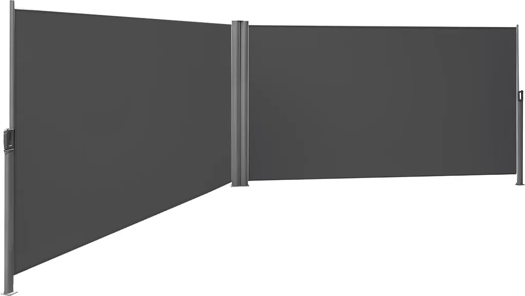 Praktische Doppelseitenmarkise: Die Seitenmarkise ist beidseitig ausziehbar, Sie können eine Seite alleine nutzen oder beide zusammen – gerade oder angewinkelt. Die Länge je Seite beträgt 3 m, insgesamt 6 m (inkl. Markisenkasten und -pfosten)
