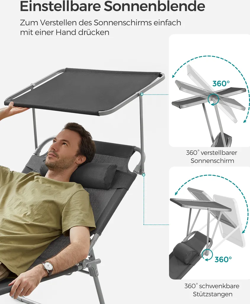 [Sonnenschutz leicht gemacht] Die Gartenliege ist mit einem Sonnenschirm ausgestattet, sodass Sie Zeitschriften lesen können, ohne geblendet zu werden, während Sie die Sonne im Innenhof genießen. Sie müssen nicht einmal aufstehen!