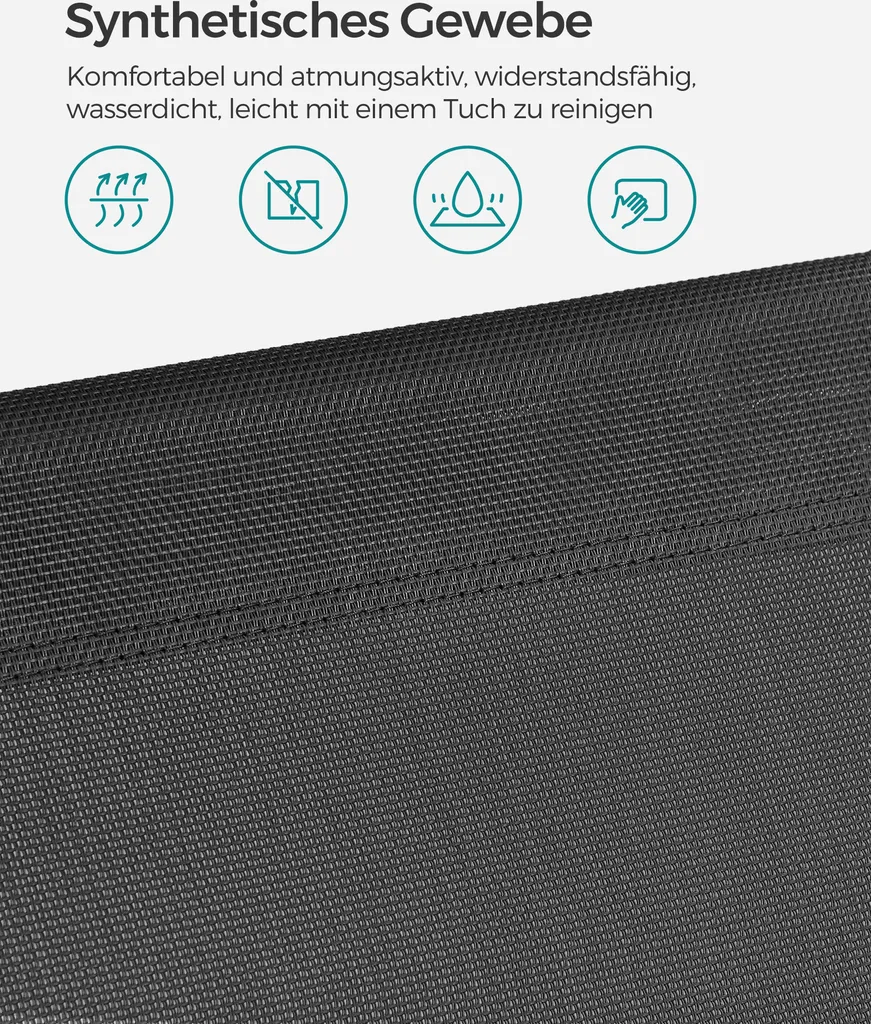 [Atmungsaktives Gewebe] Die Oberfläche der Sonnenliege besteht aus atmungsaktivem Kunststoffgewebe. Im Sommer kann die atmungsaktive Eigenschaft des synthetischen Gewebes den Körper belüften, so dass er kühl bleibt und nicht durch Schweiß am Stuhl kleben bleibt