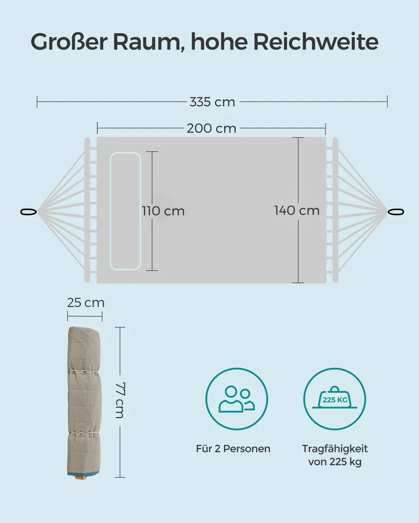 - Einfach zu falten und zu tragen: Zusammengeklappt ist diese Hängematte nur 77 x 25 x 16 cm groß und leicht zu transportieren.