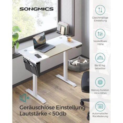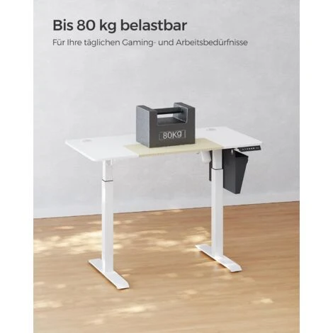 - [Was Sie bekommen] Einen elektrischen Schreibtisch mit stabilem Stahlrahmen, der bis zu 80 kg tragen kann; eine geräuscharme Tischplatte mit weniger als 50 dB Betriebsgeräusch; eine Arbeitsplatte mit Kabellöchern für weniger Kabelsalat
