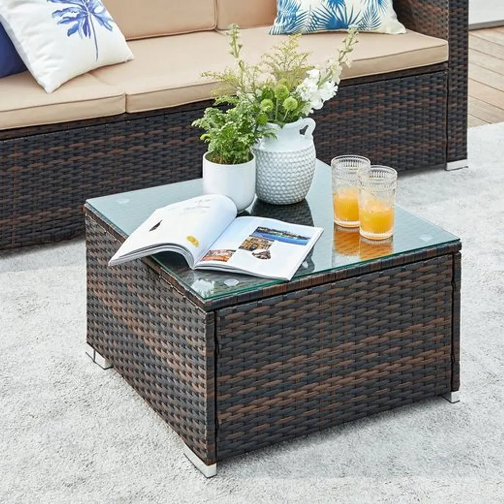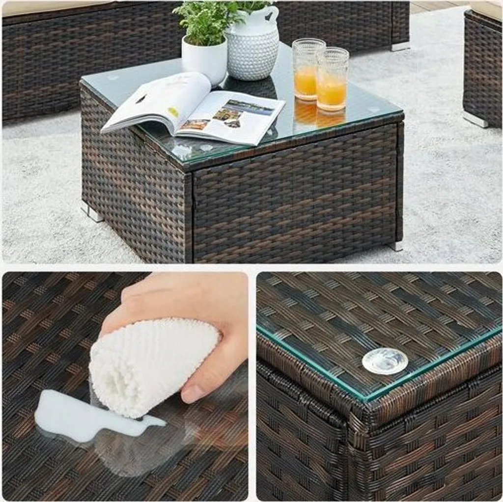 – Material des Sofas und Tisches: PE-Polyrattan (Polyethylen), pulverbeschichteter Stahl, Hartglas