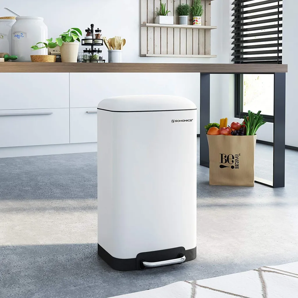 Der Mülleimer wird durch einen einfachen Fußtritt am Fußpedal aus Edelstahl geöffnet; dank eingebautem Dämpfer schlägt der Deckel nicht einfach zu und macht kein Geräusch