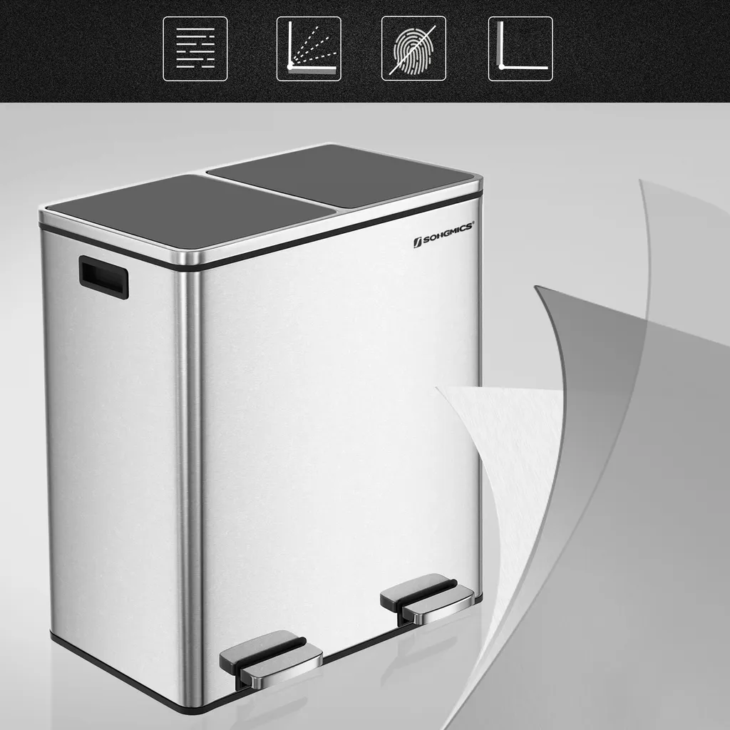 Der Treteimer besitzt 2 Einsätze. Jeder Einsatz verfügt über einen eignen Deckel, der durch einen Fußtritt am entsprechenden Pedal geöffnet wird. So müssen Sie nicht immer den gesamten Mülleimer öffnen; Platzieren Sie den rechteckigen Mülleimer ganz einfach an einer Wand. So fügt er sich perfekt in Ihre Räumlichkeiten ein