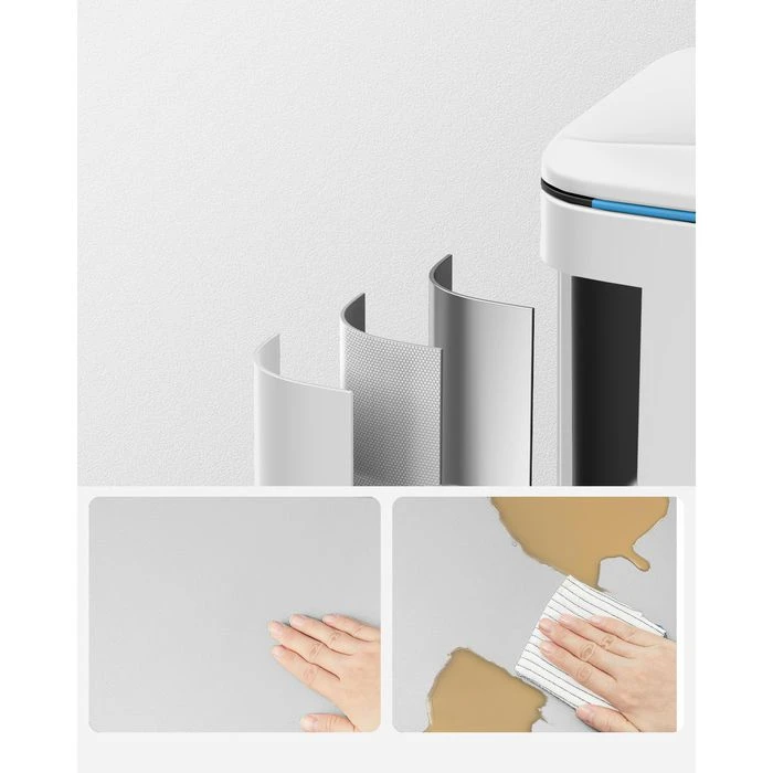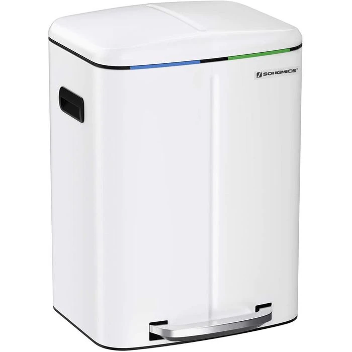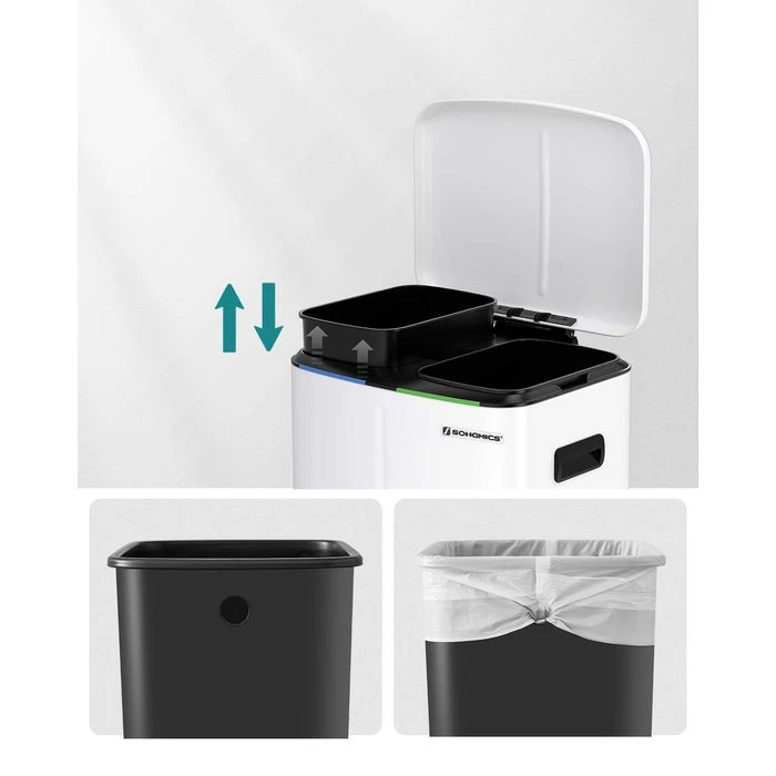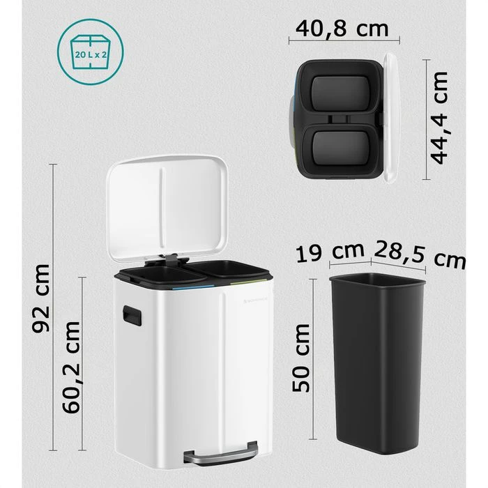 sonstiges: mit Tretmechanik aus stabilem Stahl und mit 2 herausnehmbaren schwarzen Kunststoffeimern mit Tragegriff, gedämpfter Deckel-Schließ-Mechanismus Soft Close, Deckel kann dauerhaft geöffnet bleiben, luftdichter Deckel schützt vor unangenehmen Gerüchen