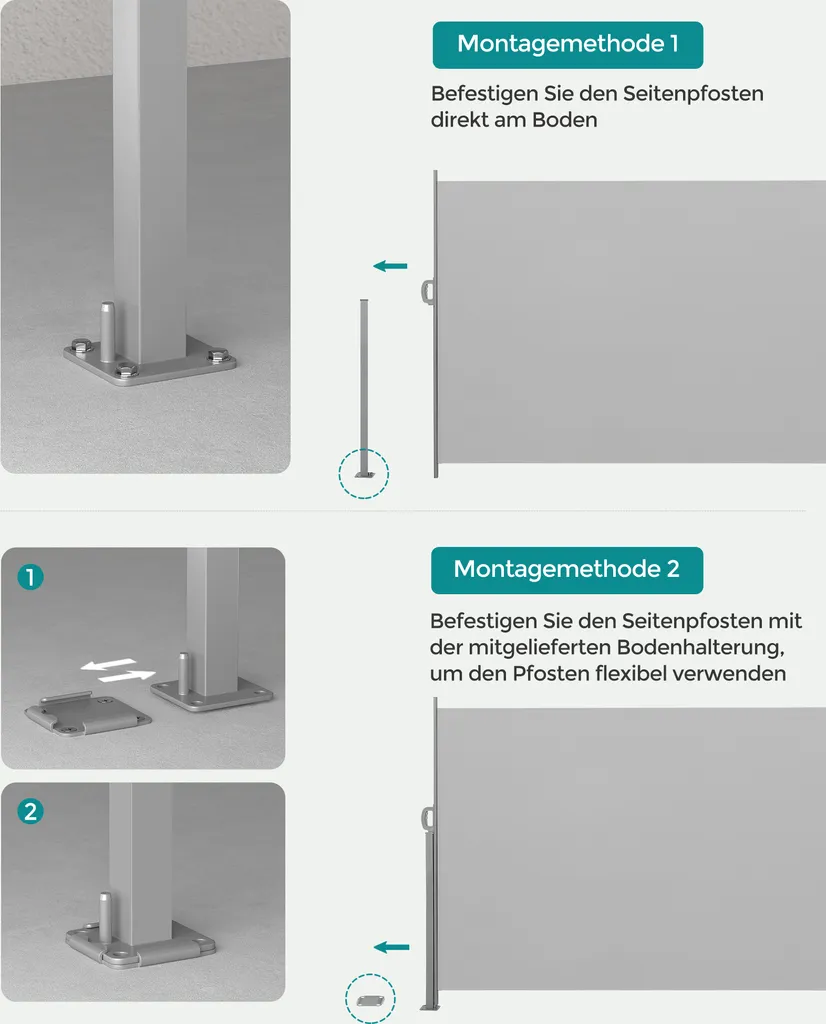 Methode 1: Befestigen Sie den Kasten an der Wand (Dicke ≥10 cm) und den Pfosten am Boden (Wenn es nicht eilig ist, die Seitenmarkise wegzuräumen).