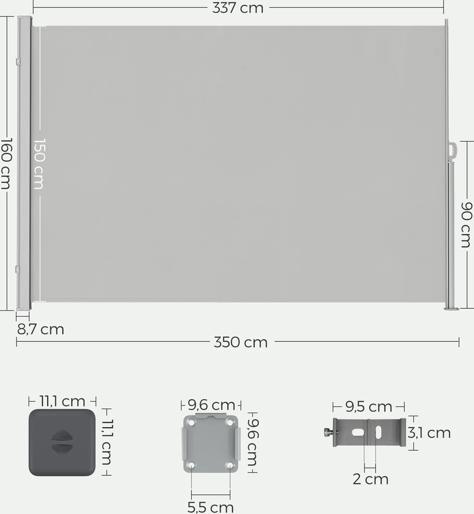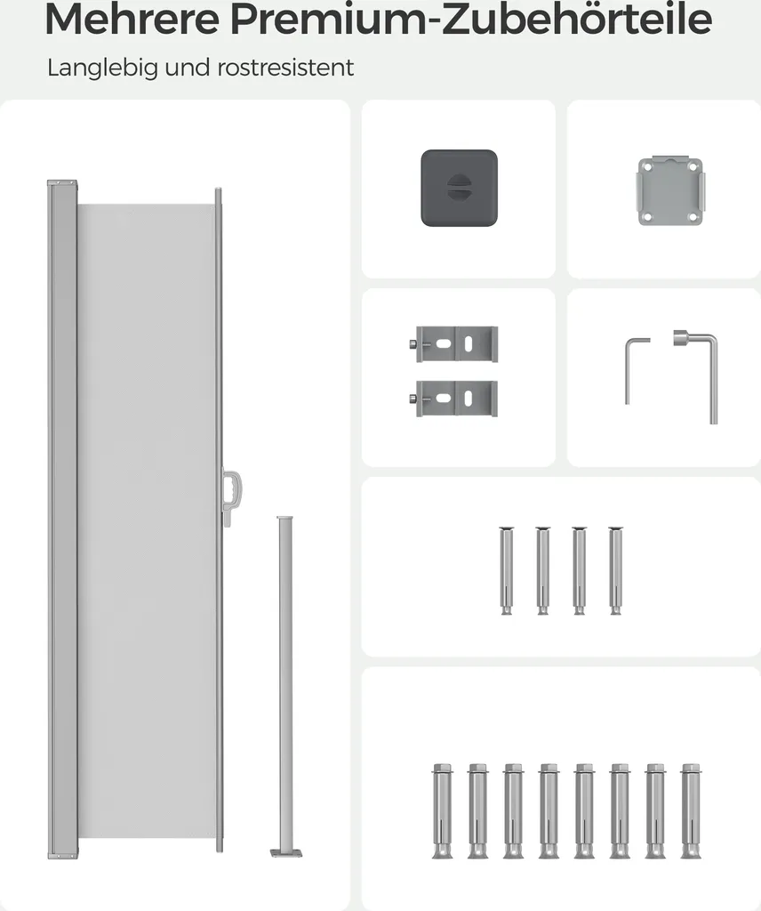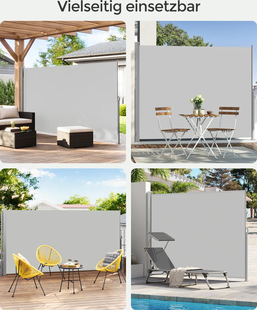 - [Was Sie bekommen] Ein 160 x 350 cm großes Seitenrollo von SONGMICS, mit dem Sie Ihren Balkon oder Ihre Terrasse abschirmen können, sowie eine Kindersicherung am Griff, die diese Balkonmarkise noch zuverlässiger macht