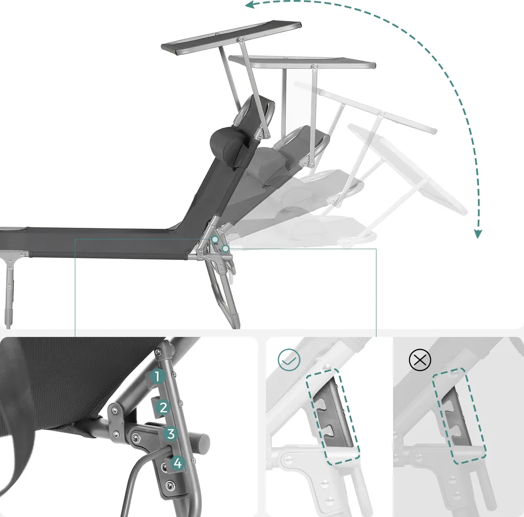 Perfekte Sommerbräune: Das grelle Sonnenlicht tut Ihren Augen weh, während Sie ein Sonnenbad nehmen? Dieser Liegestuhl besitzt eine Sonnenblende, deren Winkel Sie einfach verstellen können, ohne hierfür vom Stuhl aufstehen zu müssen – Genießen Sie in Ruhe die Sonne! Ihre Freunde werden Sie bestimmt darum bitten, das Geheimnis Ihrer schönen Haut zu enthüllen