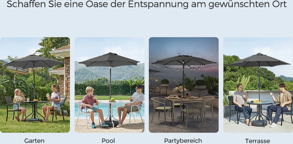 - [Für verschiedene Szenarien geeignet] Der 210 cm Sonnenschirm spendet 2-3 Personen ausreichend Schatten im Garten, auf der Terrasse, auf dem Balkon oder am Pool