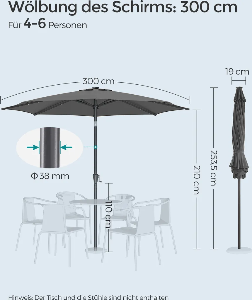 - [Viel Spaß im Freien – auch bei Nacht] Der Schirm hat 32 LED-Lämpchen, die tagsüber durch das Solarpanel mit Strom versorgt werden und nachts eine romantische Atmosphäre im Freien schaffen. Auf den Schalter am Schirmmast drücken und Lichter einschalten!