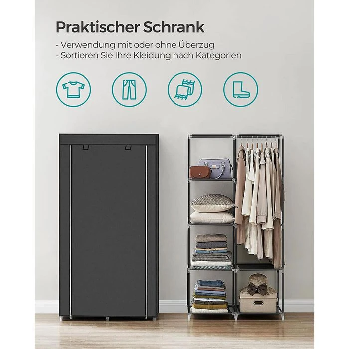 sonstiges: Türvorhang mit Reißverschlüssen, hochgerollt mit Klettverschluss zu befestigen, Fachböden bis 5 kg und Kleiderstange bis 25 kg belastbar, Überzug pflegeleicht, atmungsaktiv und feuchtigkeitsbeständig