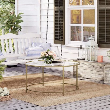 Der runde Goldrahmen aus pulverbeschichtetem Eisen sowie das Glaselement kreieren einen unverwechselbaren Retro-Look, welcher sowohl in stilvolle Räume mit großer Polstercouch und Teppich als auch in Zimmer mit minimalistischer Einrichtung passt.