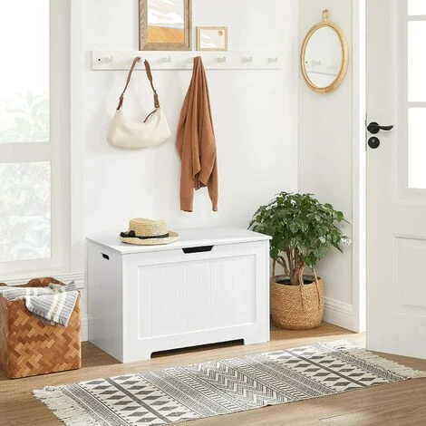 Schaffen Sie zusätzlichen Stauraum und eine Sitzgelegenheit gleichzeitig. Die große Aufbewahrungstruhe besteht aus robusten MDF-Platten. Damit können Sie alle herumliegenden Gegenstände an einem Platz unterbringen. Die Aufbewahrungsbank kann auch als Schuhbank oder Bettbank verwendet werden. Die max. Belastbarkeit beträgt 180 kg. Das geschmackvolle Weiß passt zu fast allem, völlig egal, ob Sie die Bank im Eingangsbereich, im Wohnzimmer oder im Schlafzimmer abstellen. Die speziell gestalteten Sicherheitsscharniere vermeiden ein plötzliches Schließes des Deckels und schützen Sie und Ihre Familie vor Unfällen.